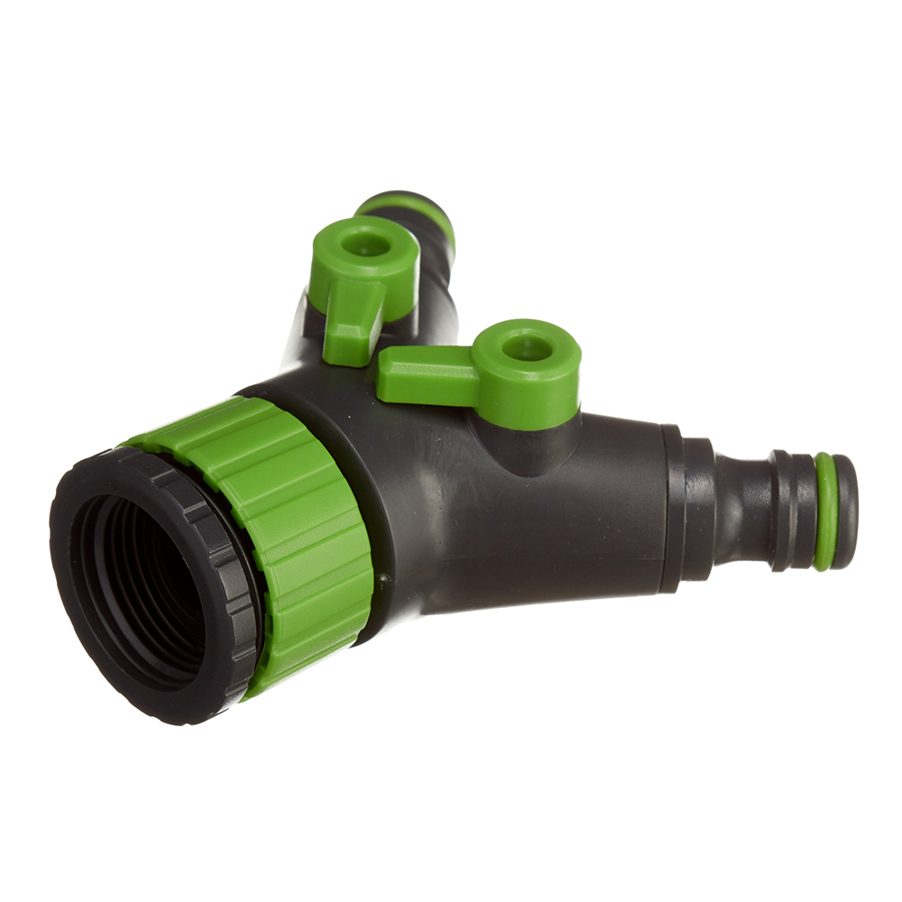 Двухканальный коннектор разветвитель на трубу 3/4″ — 1″ для распределения на два потока под быстросъем. Кран для регулировки и перекрытия потоков.