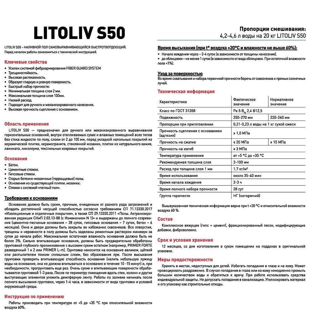 Ровнитель (наливной пол) универсальный Litokol Litoliv S50 самовыравнивающийся 20 кг