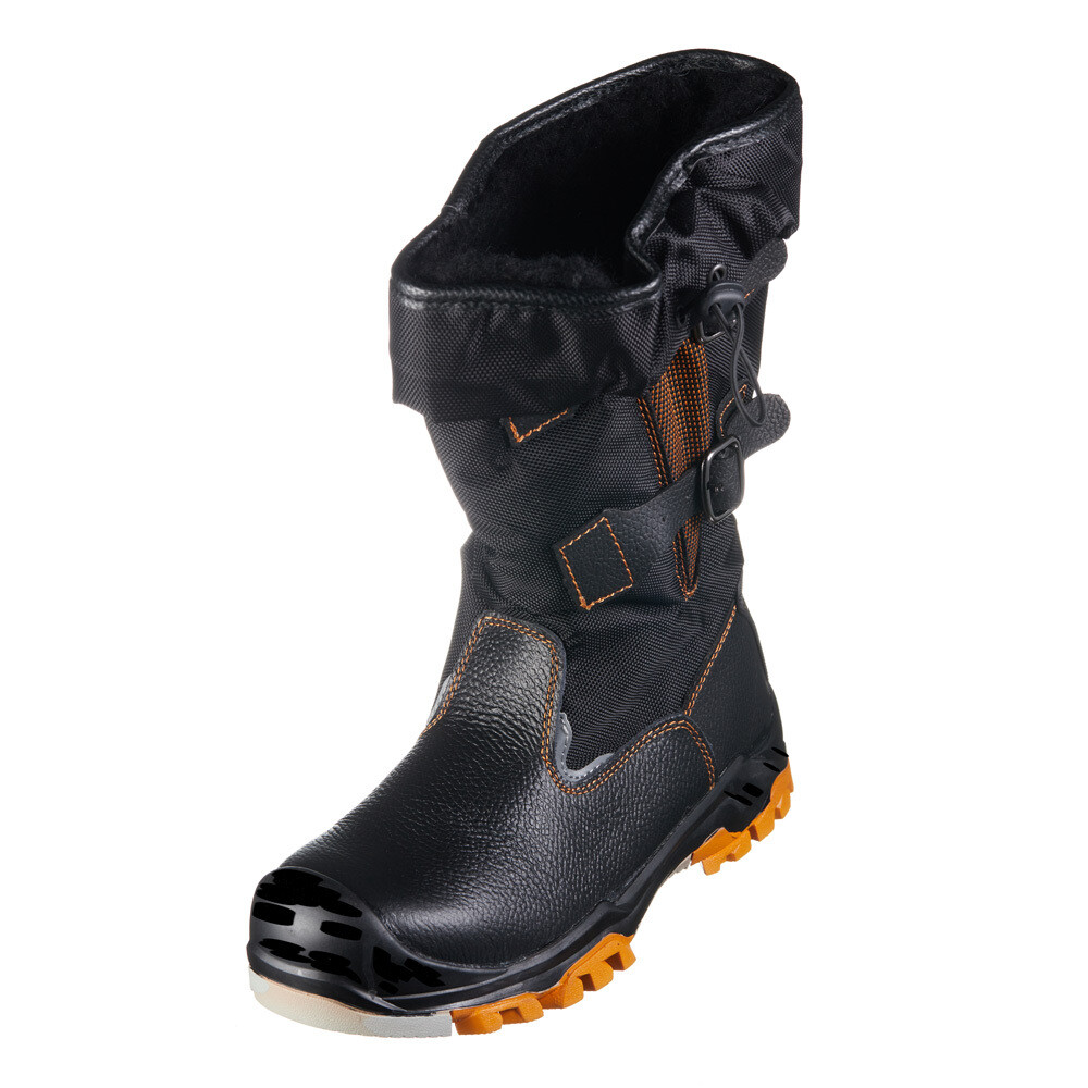 Верхняя часть обуви выполнена из термоустойчивой и водоотталкивающей кожи (юфти) с толщиной от 1,8 до 2 мм в области союзки и задника, что обеспечивает превосходную защиту и долговечность. Голенище сапог изготовлено из прочного водоотталкивающего текстиля высокой плотности, позволяющего отрегулировать ширину с помощью двух пряжек для достижения идеальной посадки на ногу. Также предусмотрена текстильная надставка на шнурке с фиксатором для дополнительной устойчивости и комфорта. Подошва двухслойная, выполнена из ПУ-нитрила, что обеспечивает устойчивость и износостойкость. В носочной части сапога расположена дополнительная защита в виде композитного подноска (Мун 200), который гарантирует безопасность стопы. Утеплитель состоит из нескольких слоев — натурального шерстяного меха с плотностью 1000 гр/м2 и длиной ворса 15 мм, фольгированного слоя, создающего эффект термоса и удерживающего тепло внутри сапога, а также Тинсулейт (Thinsulate) в сочетании с текстильным материалом «Support System», который обеспечивает надежную фиксацию пятки.