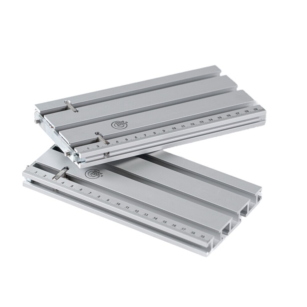Комплект для фрезерного шаблона KT RJ200 имеет пазы для крепления на заготовке или столе струбцинами.