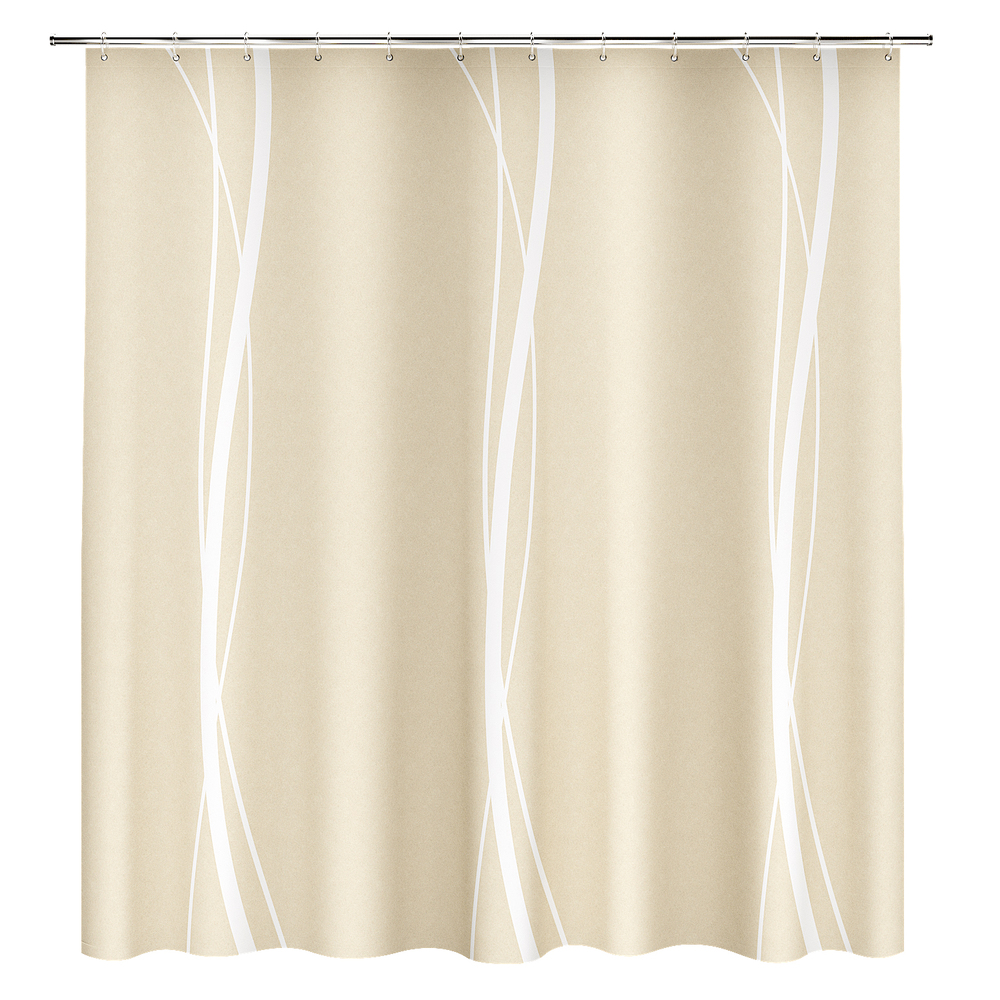 Бежевая шторка для ванной LINE с утонченным дизайном в виде изящных струящихся белых линий – это классика, которая подходит практически для всех вариантов оформления интерьера. Бежевая и белая палитра цветов является нейтральной. Ее можно комбинировать с зелеными, коричневыми, серыми, голубыми, розовыми, желтыми оттенками в интерьере ванной комнаты.