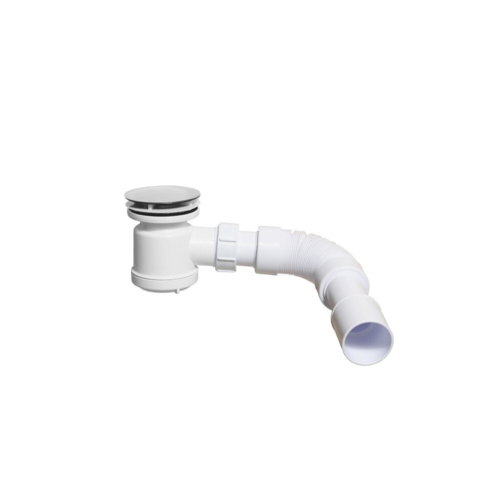Сифон бутылочный для поддона с пластиковым выпуском 85 мм и «грибком» из нержавеющей стали, раздвижной (L300-500 мм) отводной трубой. Высота – 92 мм. Сливное отверстие – 50-75 мм.