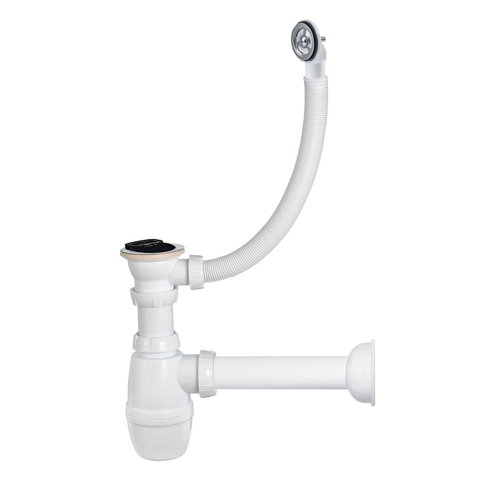 Сифон Минор с выпуском 1 1/2 х 40 мм, пробкой, круглым переливом, прямой жесткой трубой предназначен для раковин.