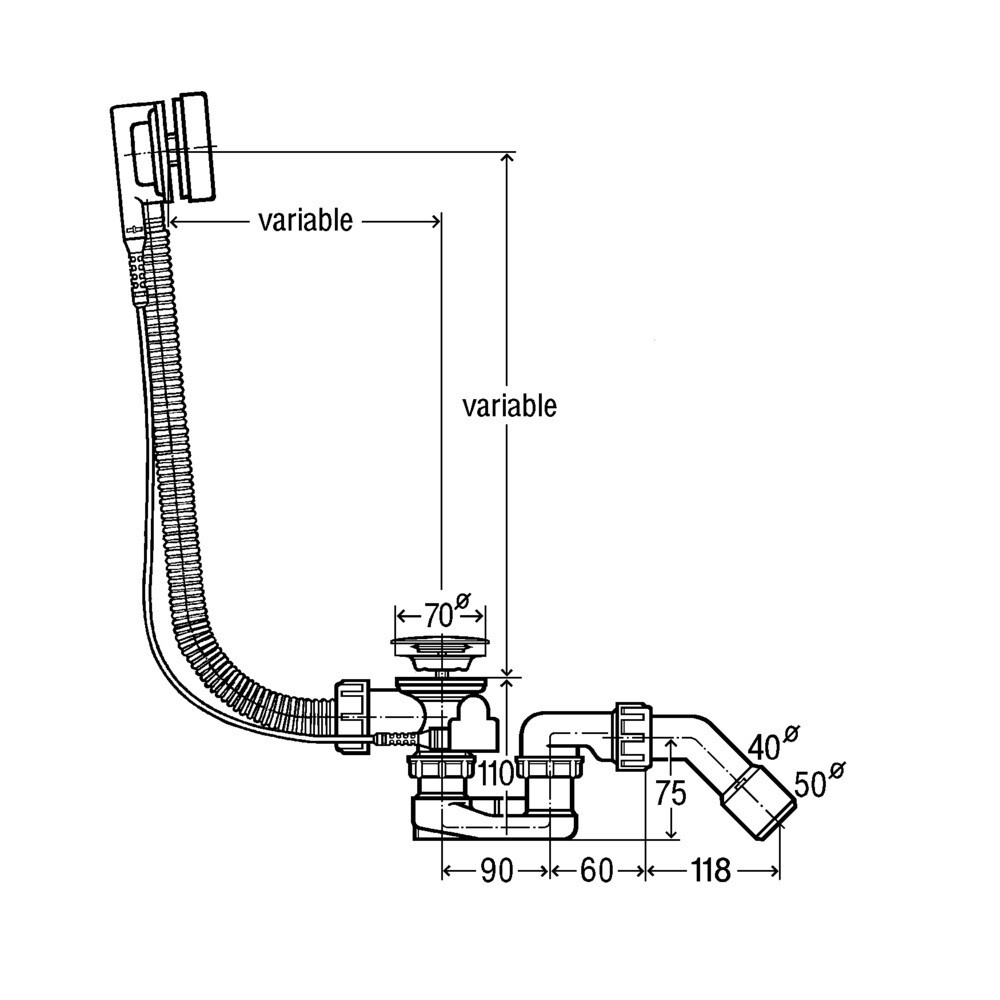 Сифон для ванны Viega Simplex 1 1/2×50 мм регулируемый полуавтомат с выпуском d70 мм с переливом с соединением 40/50 мм (595678)