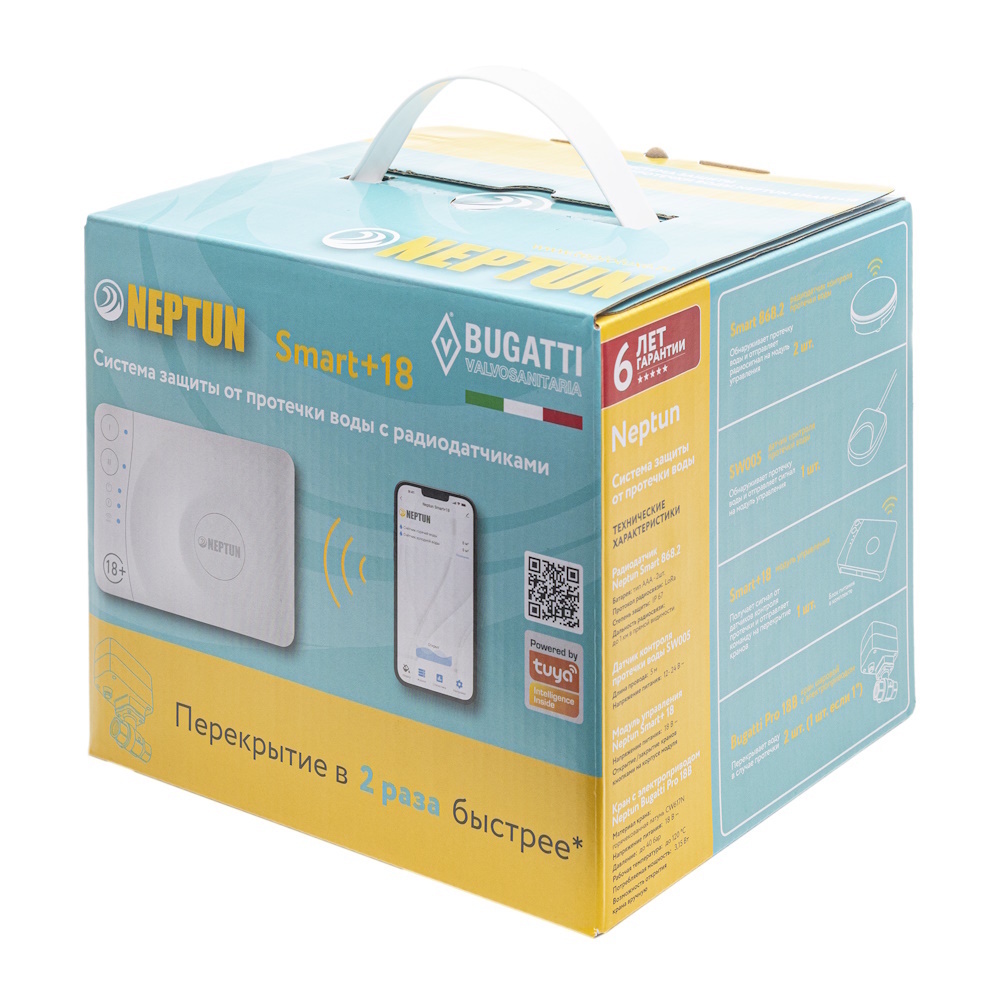 Система защиты от протечки Neptun Bugatti Smart+ 18. При обнаружении протечки краны перекроет воду в 2 раза быстрее по сравнению с другими системами Neptun. Компоненты системы связаны и взаимодействуют друг с другом через центральный контроллер (модуль управления Neptun Smart+ 18), который может быть укомплектован дополнительными платами расширения RS-485 (для систем диспетчеризации).