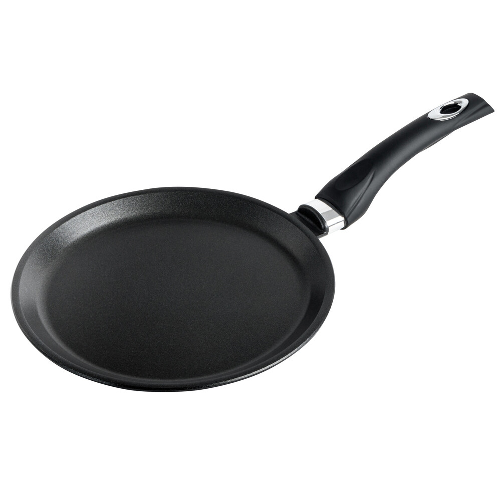 Блинная сковорода с антипригарным покрытием — литая алюминиевая посуда, которая подходит для газовых, электрических и стеклокерамических плит. При минимальном использовании масла получаются тонкие блины и пышные оладьи.