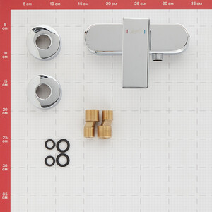 Комплектация: Смеситель в сборе, круглая уплотнительная прокладка — 2 шт., эксцентриковый S-образный крепеж 1/2 х 3/4 дюйм — 2 шт., чашки декоративные (отражатели) — 2 шт.