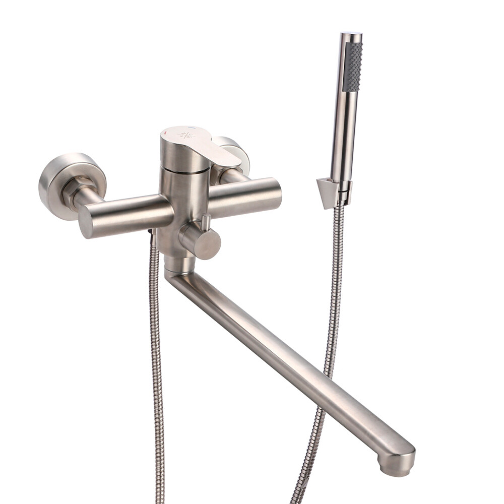 Смеситель для ванны РМС SUS124 сталь однорычажный с длинным изливом с лейкой (SUS124-006EP)