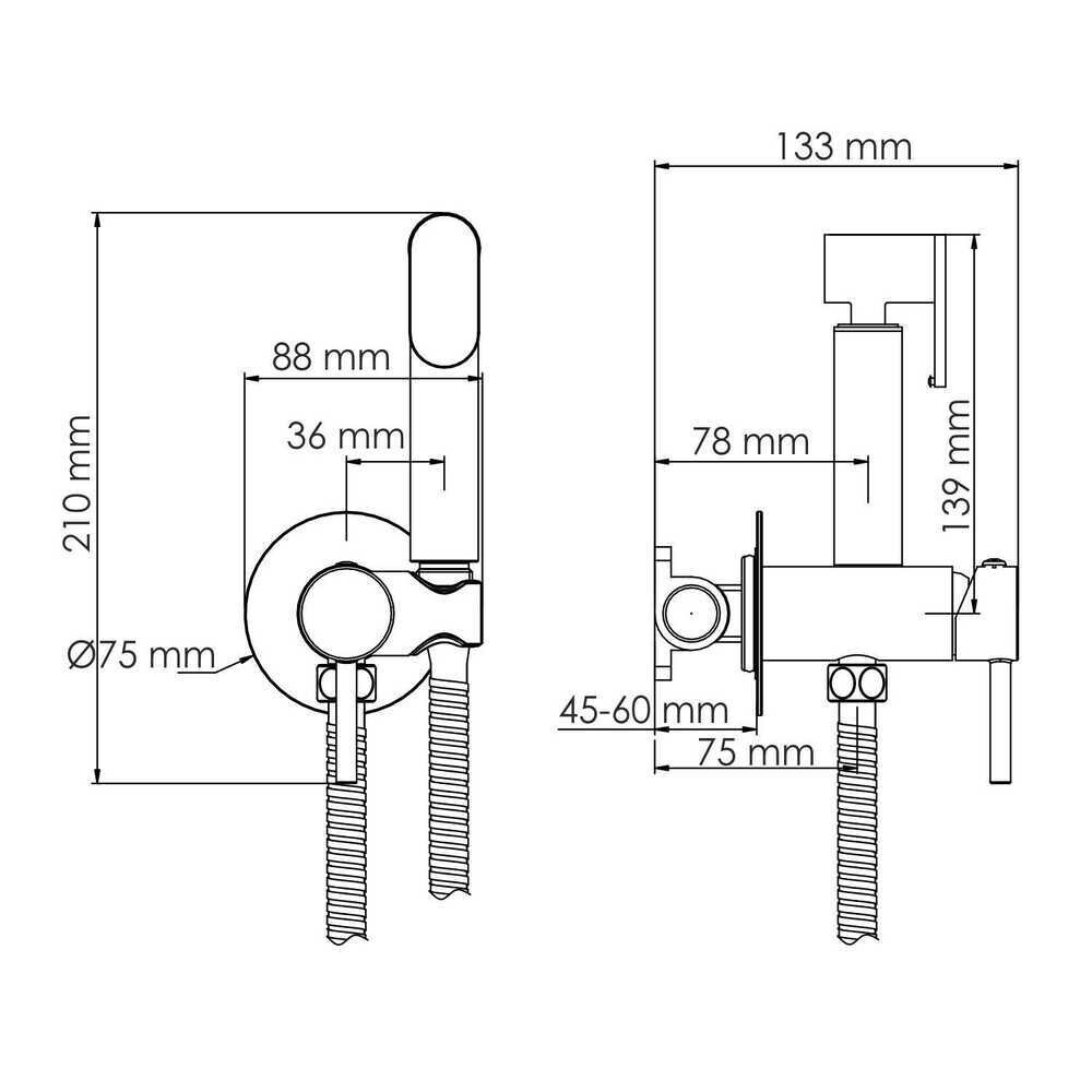 Смеситель – 1 шт., металлический шланг – 1 шт., гигиеническая лейка – 1 шт., набор для монтажа – 1 шт.