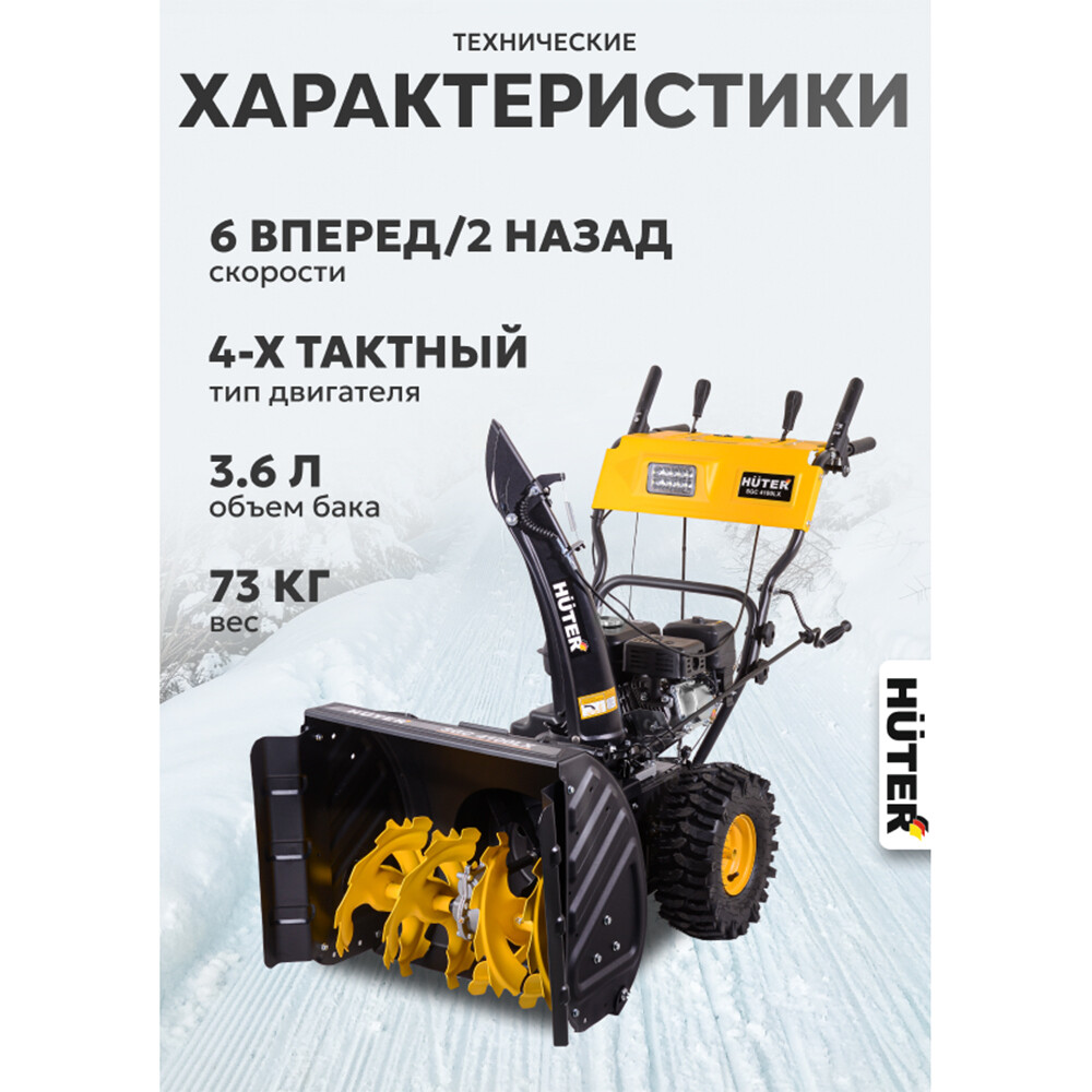 Снегоуборщик Huter SGC 4100LX мощностью 7 л.с. позволяет быстро и эффективно очищать территорию от снега. Надежный 4-тактный бензиновый двигатель объемом 212 см³ имеет высокий КПД.