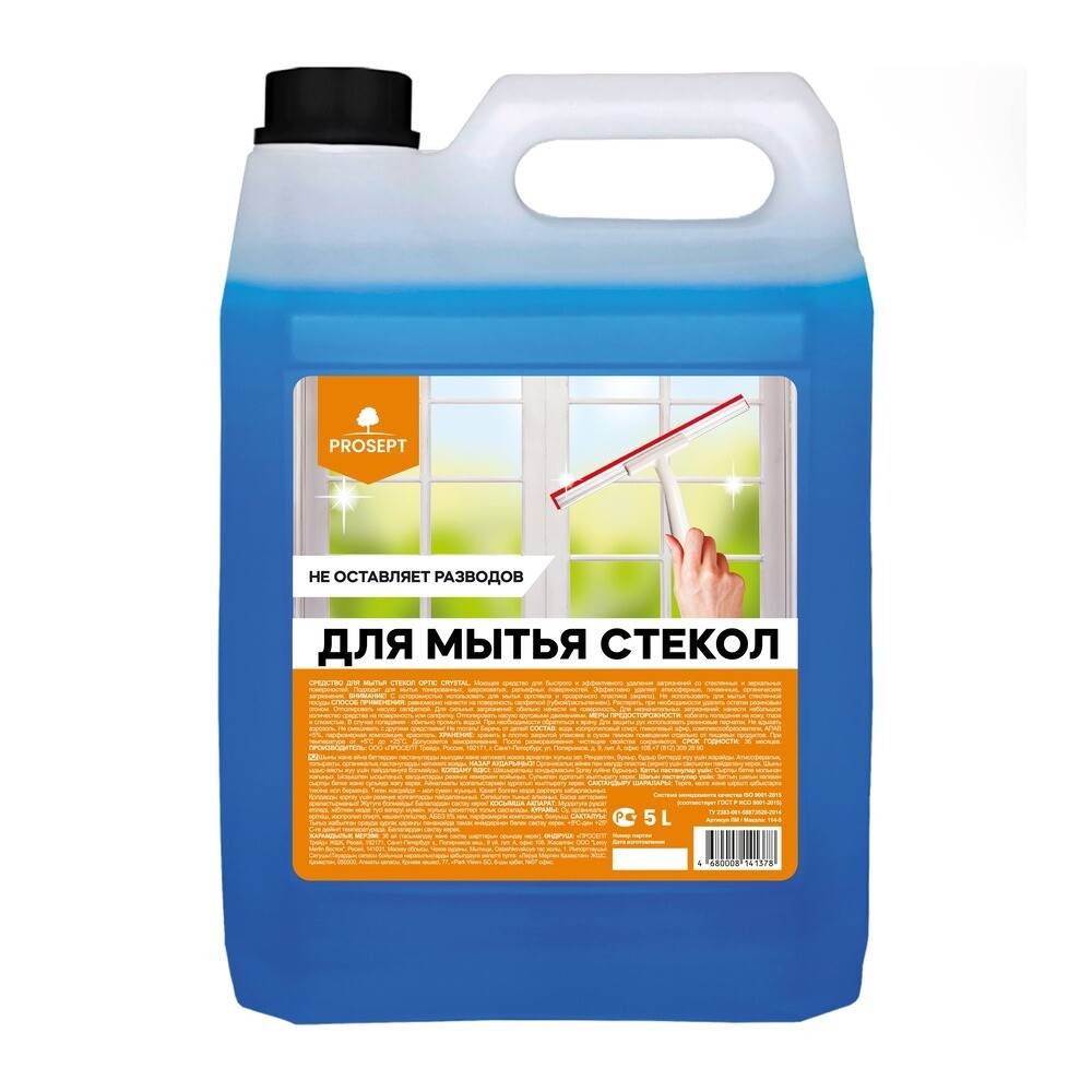Optic Crystal — щелочное моющее средство. Удаляет атмосферные, почвенные и органические загрязнения со всех видов стеклянных и зеркальных поверхностей, в том числе тонированных, шероховатых, рельефных. Не оставляет разводов. Быстро сохнет. Для ежедневного и периодического мытья окон, витрин, витражей, стеклянных дверей и перегородок, панорамных стекол, панелей, стеклоблоков.
