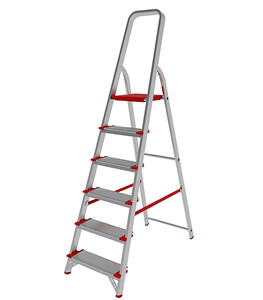 В основании стремянки прочная рама из алюминиевого профиля прямоугольного сечения. Пластиковые наконечники препятствуют скольжению, и обеспечивают отличную устойчивость. Многократное клепаное соединение ступеней с рамой обеспечивает исключительную надежность и безопасность при работе на стремянке. Имеет шесть ступеней шириной 130 мм, что позволяет стопе комфортно размещаться на лестнице.