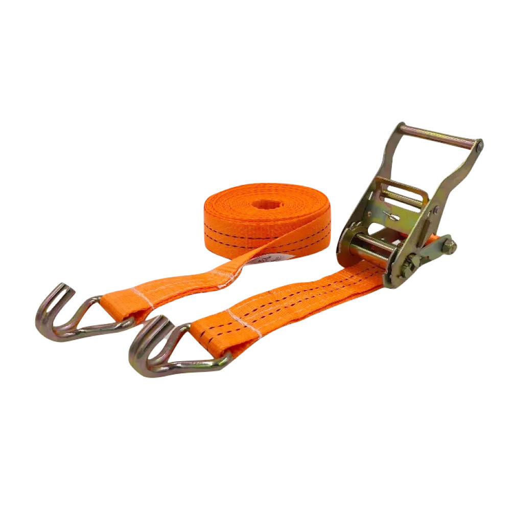 Высококачественный ремень крепления груза комплектуется храповым механизмом, что позволяет надежно зафиксировать груз относительно поверхности, на которой он размещен для перевозки. Материал изготовления ремня – сертифицированная полиэстеровая лента прочная и долговечная. Ремень устойчив к истиранию и негативному воздействию окружающей среды.