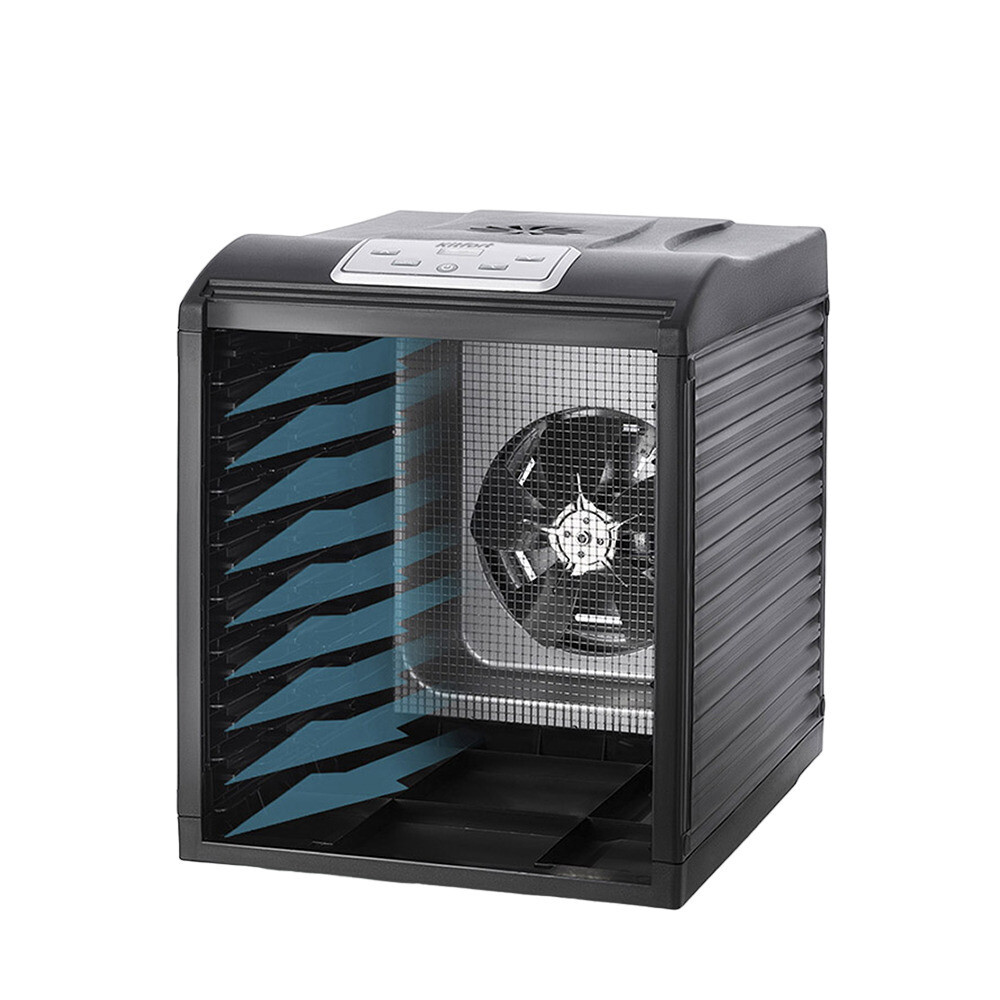 Сушилка Kitfort KT-1908 оборудована большим мощным вентилятором, что обеспечивает равномерный горизонтальный обдув всех 9 поддонов.