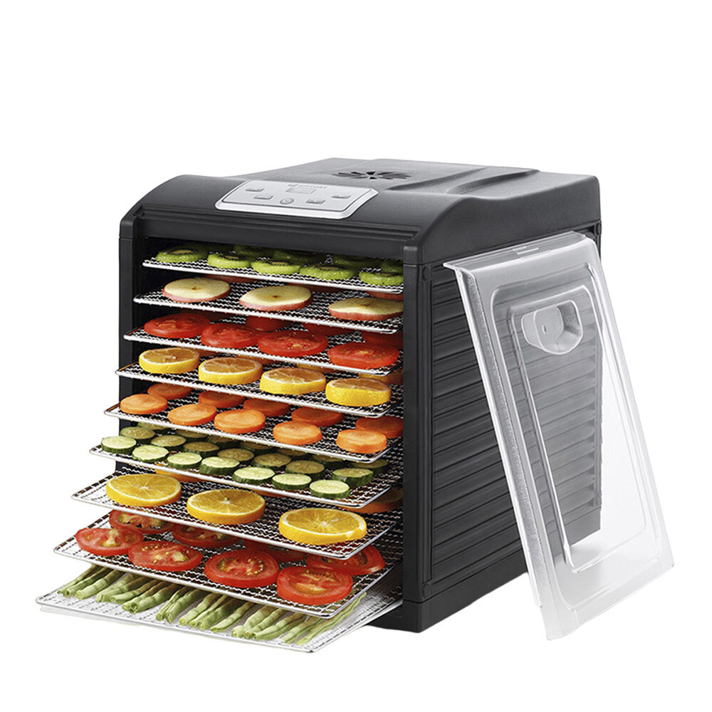 Сушилка Kitfort KT-1908 оборудована большим мощным вентилятором, что обеспечивает равномерный горизонтальный обдув всех 9 поддонов. Поток воздуха направлен горизонтально, поэтому запахи продуктов с разных поддонов не смешиваются. На сушилке можно установить температуру сушки в диапазоне 35-70 °С с шагом в 5 градусов. Сушилка оснащена таймером до 19,5 часов с шагом 30 минут. 9 металлических поддонов, 9 поддонов с бортиками для пастилы и 9 сеток помогут разместить внутри сушки абсолютно любые продукты. Прибор имеет строгие формы и минималистичный стильный дизайн. Дверца полностью снимается, через неё удобно наблюдать за ходом сушки.