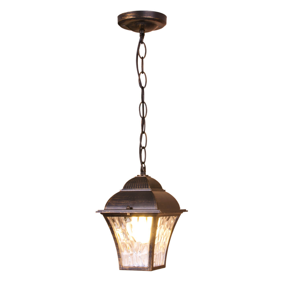 Предназначен для создания дополнительного освещения, а также декоративной подсветки снаружи помещений. Благодаря стеклянному плафону создает мягкое равномерное свечение. В качестве источника света используются сменные лампы с цоколем E27. Патрон рассчитан на максимальную мощность ламп накаливания 60 Вт. Корпус светильника выполнен из высококачественного и прочного металла с надежным покрытием. Уличный подвесной светильник Apus H черное золото IP33 легко монтируется при помощи крепежной планки, которая обеспечивает надежную фиксацию светильника.