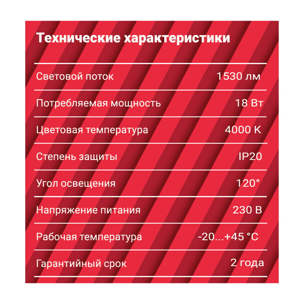 18 Вт – потребляемая мощность, 4000 K – цветовая температура света в градусах Кельвина, 190 мм – диаметр светильника.