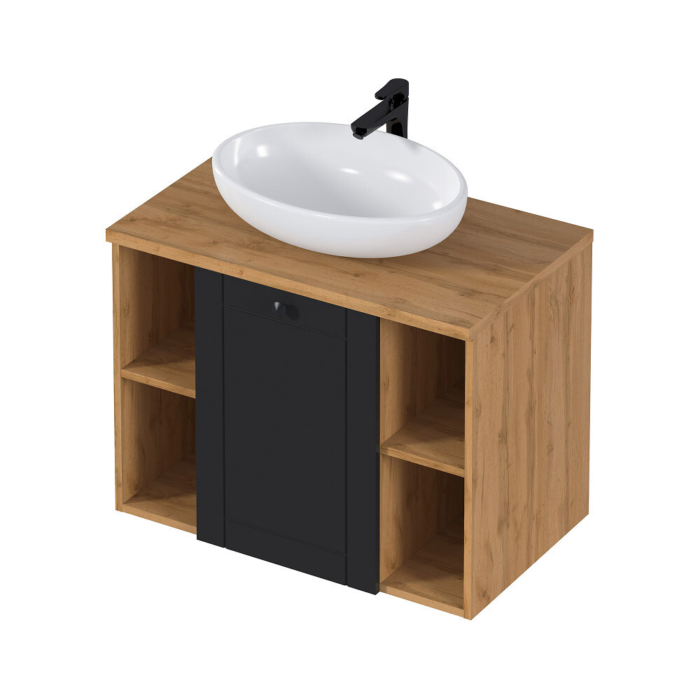 Круглые ручки удобны в использовании, они добавляют шарма модели. А стильный образ тумбы завершает накладная раковина.