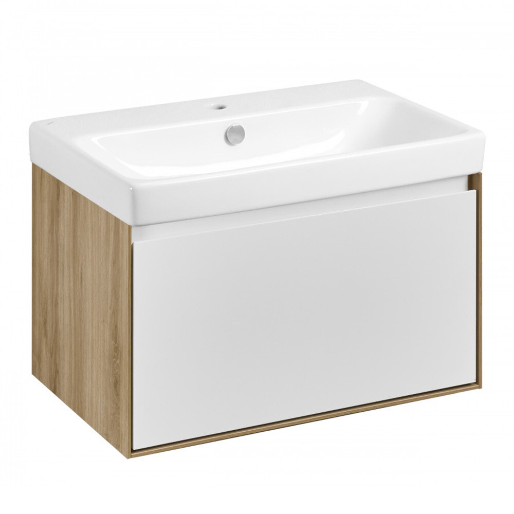 Тумба с 1 ящиком выполнена в скандинавском стиле — сочетание теплого дерева и строгого белого глянца. Корпус и внутренняя организация тумбы изготовлены из влагостойкой ЛДСП, имитирующей текстуру дерева, а фасад выполнен из влагостойкой ЛДСП в покраске белый глянец. Боковины тумбы обработаны по особой технологии, создающей эффект тонких линий и в то же время сохраняющей надежность конструкции. Ящик открывается одним нажатием, так как оснащен механизмом Push-to-Open, гарантирующим плавное открывание и закрывание. Тумба Либерти может быть дополнена мебельной раковиной “Адриана”, которая отличается вместительной чашей и современным дизайном. Также она совместима с накладными раковинами Santek Одри и Round, а также Aquaton Лола, что позволяет выбрать наиболее подходящий вариант для вашего интерьера. Тумба отличается простотой и элегантностью, идеально сочетая функциональность и стиль. Она станет отличным выбором для тех, кто ценит качество, комфорт и эстетику в интерьере ванной комнаты.