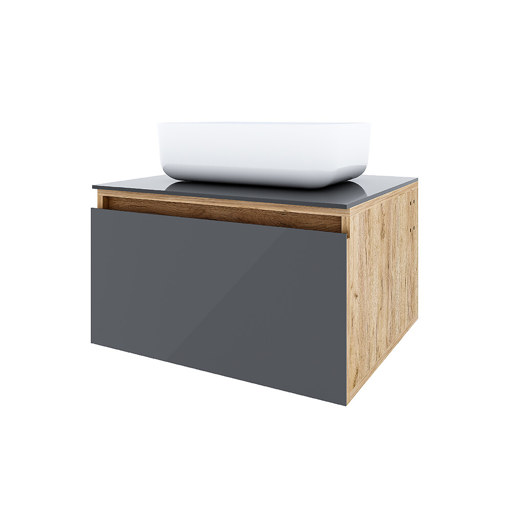 — Фасад и столешница тумбы выполнены из безопасного закалённого стекла молочного цвета, корпус — влагостойкий ЛДСП цвета дуб крафт золотой.