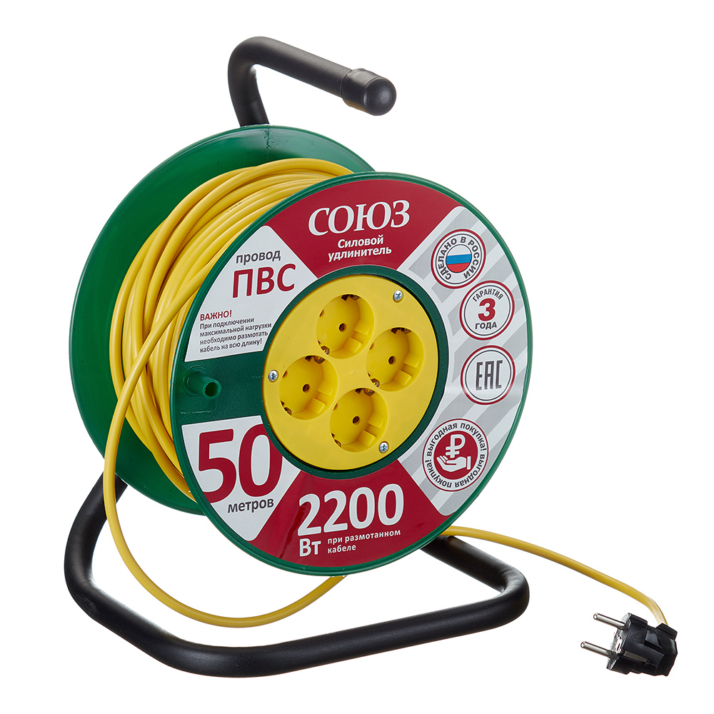 Удлинитель Союз с заземлением 50 м на катушке 2,2 кВт 4 розетки ПВС 3х0,75 кв.мм IP20