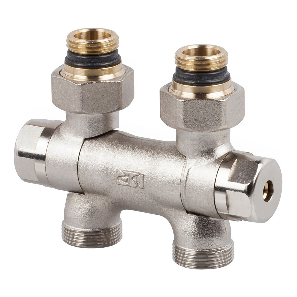Двойной запорный клапан, межосевое расстояние 50 мм для одно/двухтрубных систем с ориентируемыми соединениями (для отвода в пол или стену), пошаговая регулировка by-pass, сменное соединение для медных и многослойных труб.