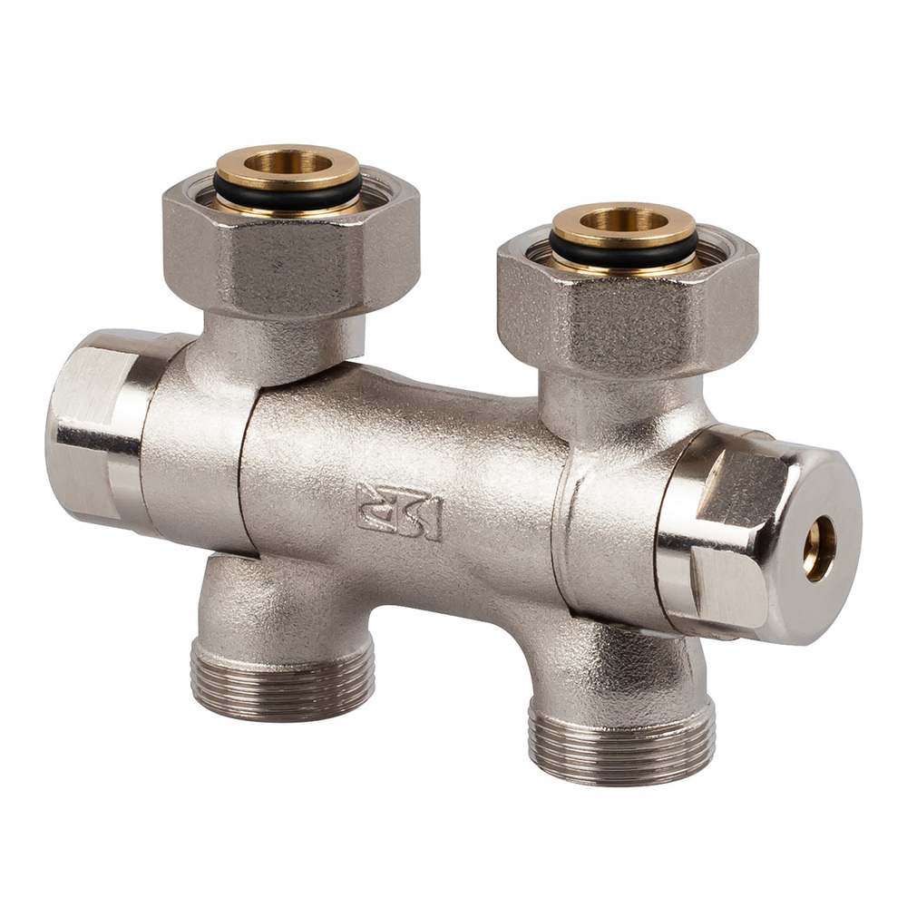 Двойной запорный клапан, межосевое расстояние 50 мм для одно/двухтрубных систем с ориентируемыми соединениями (для отвода в пол или стену), пошаговая регулировка by-pass, сменное соединение для медных и многослойных труб.