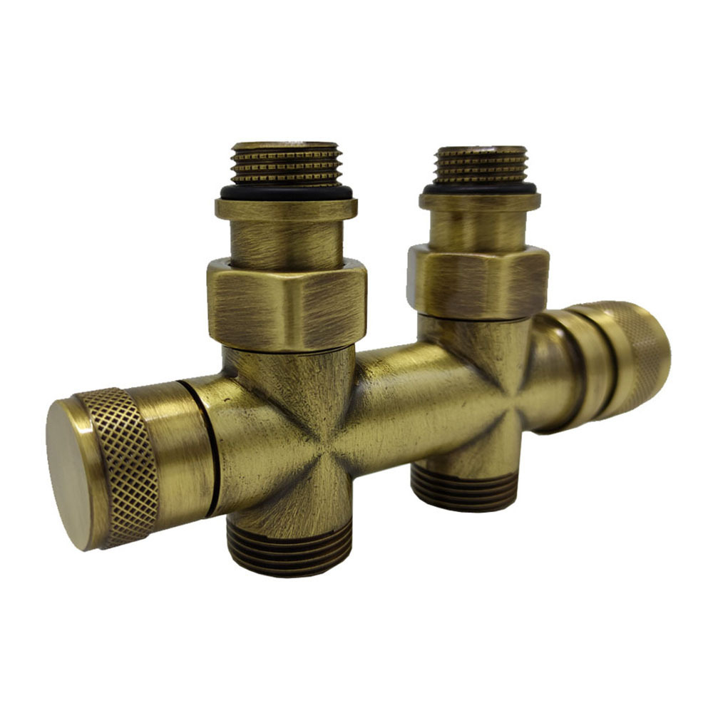 Узел SR Rubinetterie прямой для нижнего подключения радиаторов — вентиль на подачу ручной регулировки, преобразуемый в термостатический, с механизмом предварительной настройки и запорный клапан. Межосевое расстояние 50 мм, соединение для медных или многослойных труб, резьбовые переходники для подключения к радиатору с герметичной прокладкой.