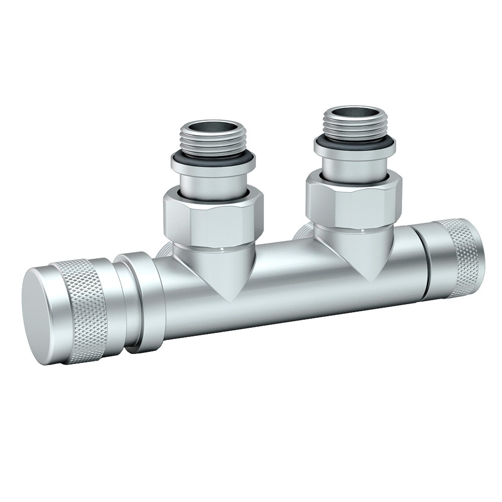 Узел SR Rubinetterie угловой для нижнего подключения радиаторов — вентиль на подачу ручной регулировки, преобразуемый в термостатический, с механизмом предварительной настройки и запорный клапан. Межосевое расстояние 50 мм, соединение для медных или многослойных труб, резьбовые переходники для подключения к радиатору с герметичной прокладкой.