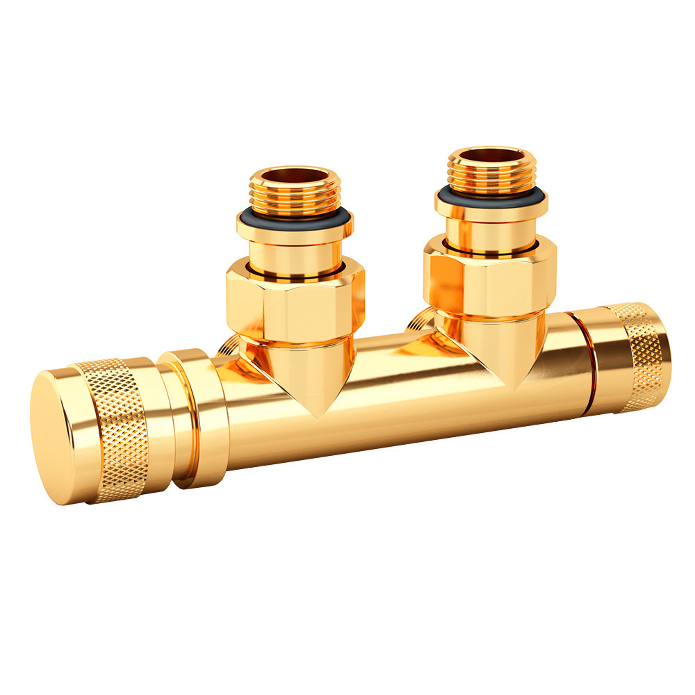 Узел SR Rubinetterie угловой для нижнего подключения радиаторов — вентиль на подачу ручной регулировки, преобразуемый в термостатический, с механизмом предварительной настройки и запорный клапан. Межосевое расстояние 50 мм, соединение для медных или многослойных труб, резьбовые переходники для подключения к радиатору с герметичной прокладкой.