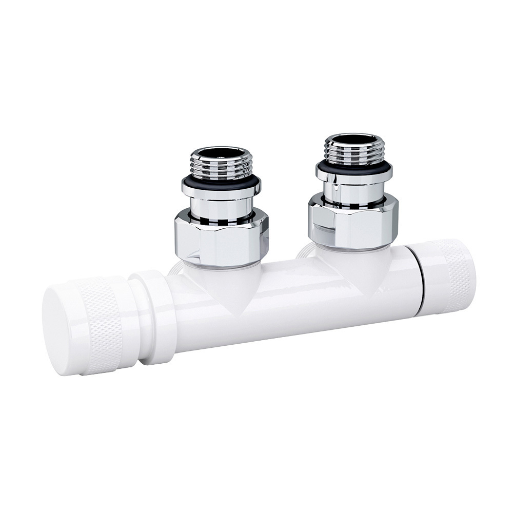 Узел SR Rubinetterie угловой для нижнего подключения радиаторов — вентиль на подачу ручной регулировки, преобразуемый в термостатический, с механизмом предварительной настройки и запорный клапан. Межосевое расстояние 50 мм, соединение для медных или многослойных труб, резьбовые переходники для подключения к радиатору с герметичной прокладкой.