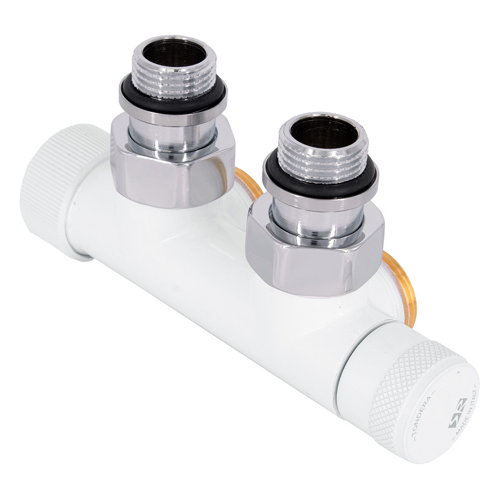 Узел SR Rubinetterie угловой для нижнего подключения радиаторов — вентиль на подачу термостатический, с механизмом предварительной настройки и запорный клапан. Межосевое расстояние 50 мм, соединение для медных труб или многослойных труб, резьбовые переходники для подключения к радиатору с герметичной прокладкой.