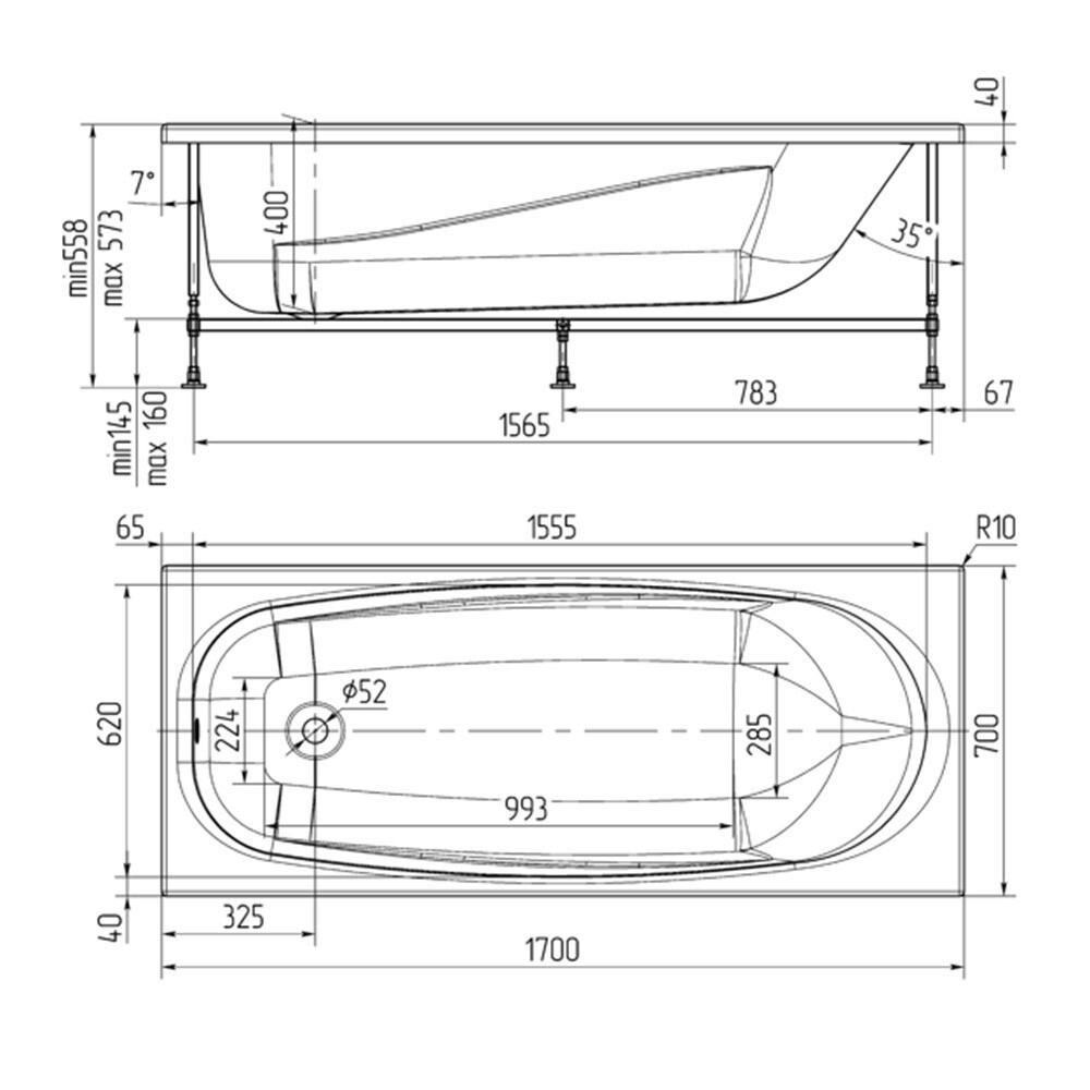 Ванна акриловая 170х70 см без ножек