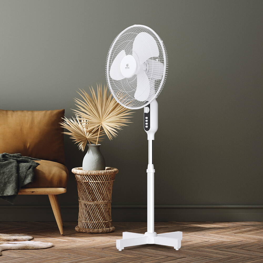 Вентилятор имеет 3 скорости работы и широкоугольный поворот в горизонтальной плоскости. Дополнительным преимуществом является встроенный таймер, с возможностью установки времени на отключение до 2 часов. Высота прибора регулируется и может достигать 1,25 метра. Прибор имеет устойчивое крестообразное основание.