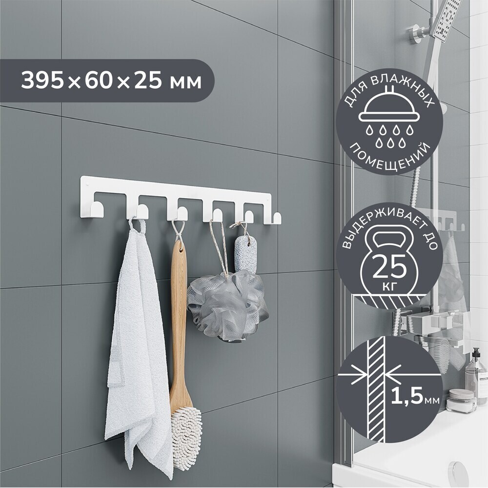 Вешалка для ванной Ulitka Scandy 6 крючков на шуруп металл белый (74104334)