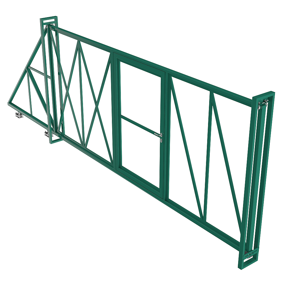 Каркас откатных ворот с калиткой предназначен для самостоятельного заполнения профлистом, металлическим штакетником, сеткой 3D и подходит для установки автоматики.
