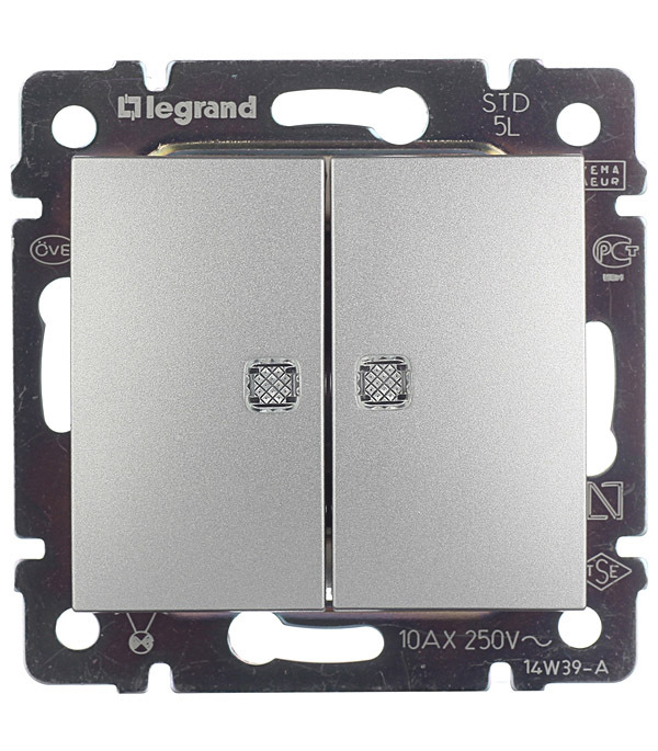 Выключатель Legrand Valena двухклавишный встраиваемый алюминий с подсветкой (694344)