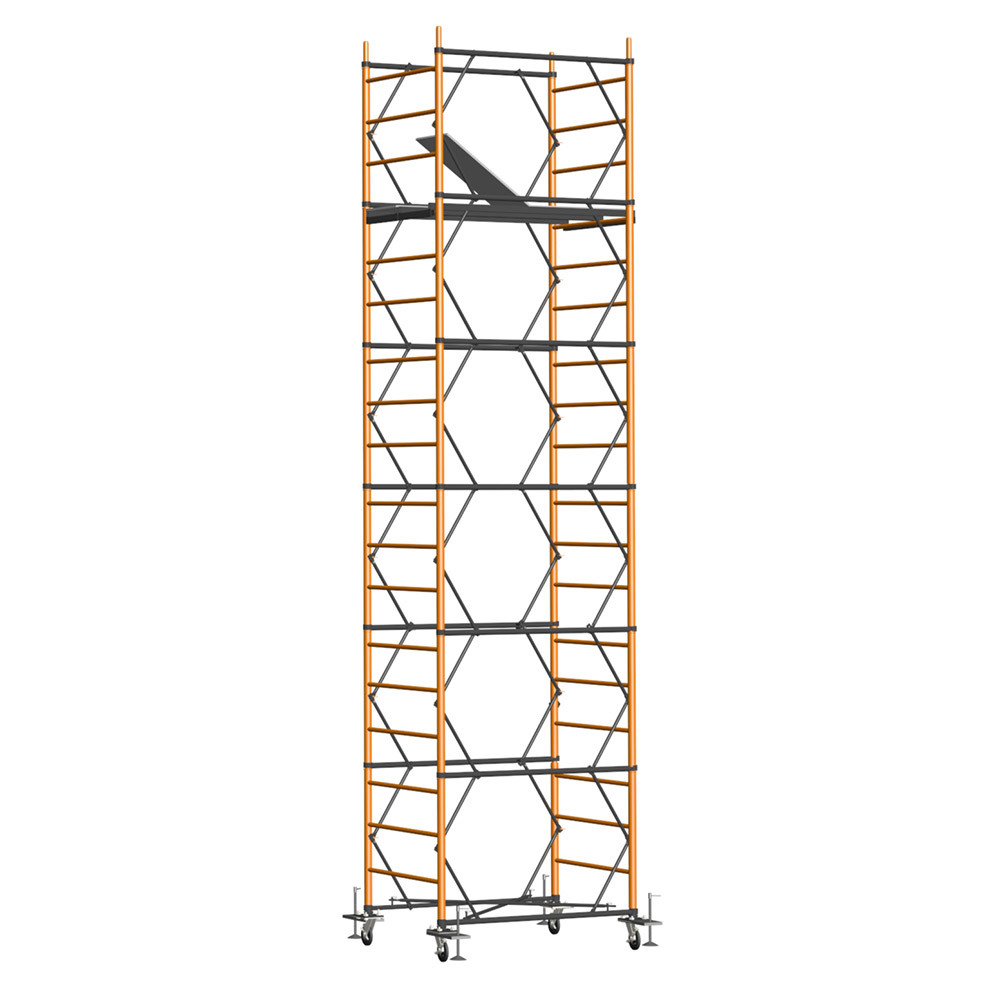 Передвижная вышка-тура — это вертикальная конструкция башенного типа на колесах, состоящая из базового блока и шести промежуточных секций, с рабочей площадкой размером 1,7 х 0,9 м. Вышка собирается из металлических плоских рам и диагональных связей, которые входят в состав секций и нижнего основания. Изготовлены рамы и связи из стальных тонкостенных труб разного диаметра, окрашенных порошковой эмалью. Имеет четыре съемных винтовых опоры для работы на неровных площадях, четыре поворотных обрезиненных колеса.