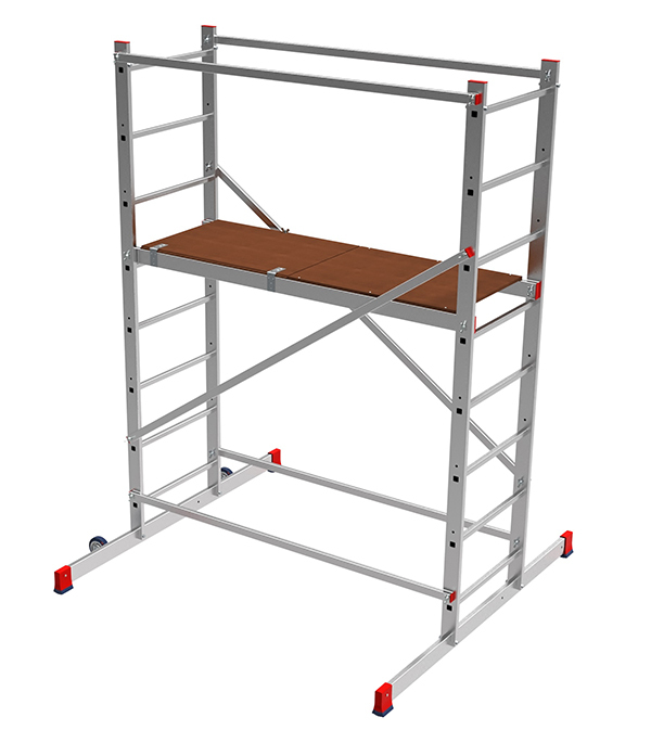Вышка-тура — многофункциональная конструкция, состоящая из 2-х приставных лестниц с 8 ступенями и рабочей платформы 140 х 50 см (длина х ширина). У вышки перфорированные ступени, которые обеспечивают безопасный подъем на высоту, широкие поперечные траверсы с двухкомпонентными противоскользящими башмаками на концах профилей для обеспечения безупречной устойчивости конструкции на опорной платформе. Ролики на одной из боковин обеспечивают удобное перемещение вышки.