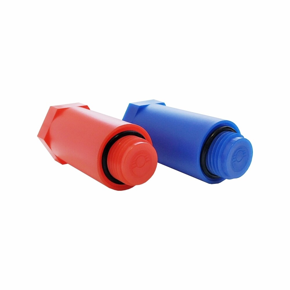 Комплект длинных полипропиленовых пробок (синяя и красная), предназначенных для герметичного перекрытия трубопровода в неиспользуемых патрубках фитингов или арматуры с внутренней резьбой.