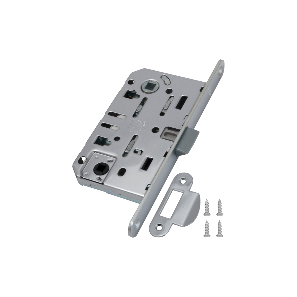 Защелка врезная бесшумная с пластиковым языком WC серии Mediana Evolution предназначена для установки в межкомнатные двери. В комплектацию входит ответная планка B01000.13.03 короткая с загнутым язычком. Защелка подходит для левых и правых дверей. Более тихое закрытие двери обеспечивается благодаря новой конструкции и новым внутренним компонентам. Бесшумная пластиковая защелка с двойным наклоном может фиксироваться ключом внутри замка (при перевозке деревянного полотна). Новая защищенная патентом система поворота защелки.