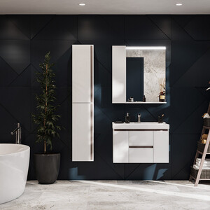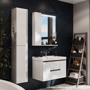 корпус и зеркальный фасад изготовлены из влагостойкой ЛДСП и покрыты полиэфирной краской ультрафиолетового отверждения, которая обеспечивает защиту от влаги и дополнительную прочность. Модель оснащена нижней полкой и светодиодной подсветкой.