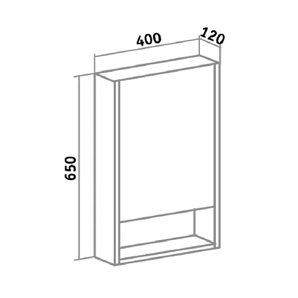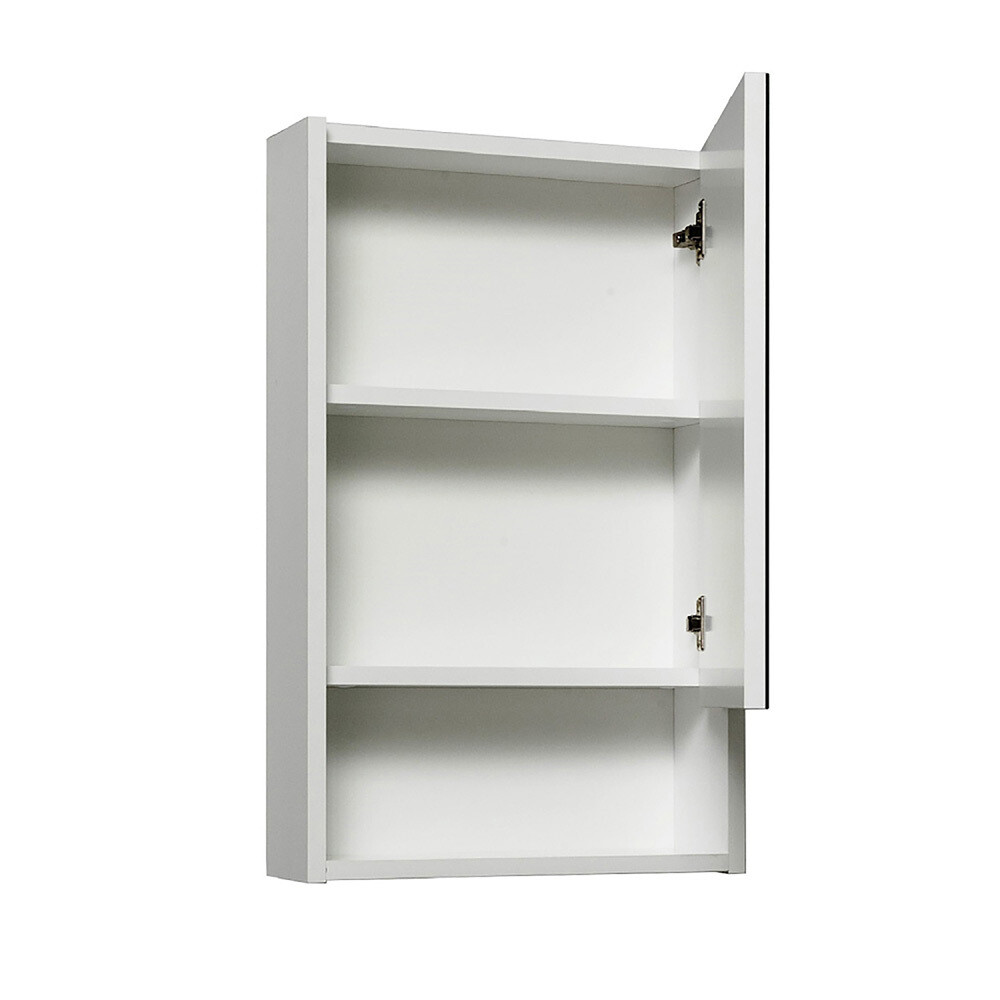 Зеркальный шкаф без подсветки с распашным фасадом и открытой нижней полкой (петли справа). Петли со встроенным доводчиком.