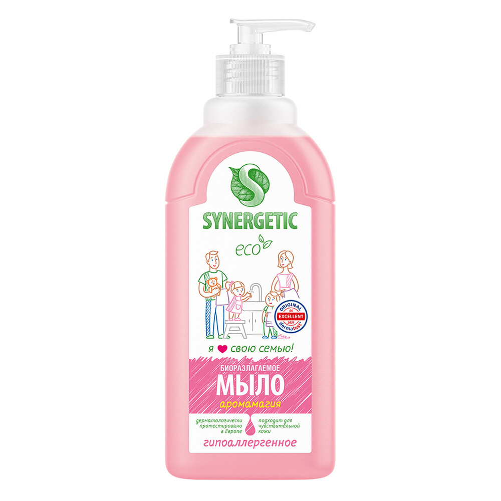 Биоразлагаемое увлажняющее мыло Synergetic «Аромамагия» подходит для бережного очищения кожи рук и тела от любых загрязнений. Комбинация растительных А-тензидов, морской соли и натуральных эфирных масел герани, нероли, жасмина и розы эффективно устраняет загрязнения и неприятные запахи даже в холодной воде. Растительный глицерин обеспечивает интенсивное увлажнение кожи. Мультифункциональный компонент софоролипид мягко очищает и заботится о естественном микробиоме кожи. Гипоаллергенное средство подходит для чувствительной кожи.