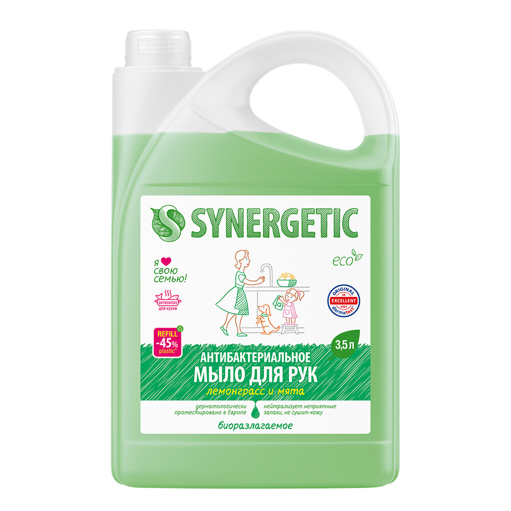 Антибактериальное увлажняющее жидкое мыло Synergetic «Лемонграсс и мята» эффективно очищает кожу от любых загрязнений даже в холодной воде. Особенно эффективно против неприятных запахов. Комбинация растительных К-тензидов, морской соли и натуральных эфирных масел лемонграсса, мяты, чайного дерева, эвкалипта и тимьяна обеспечивает длительный антибактериальный эффект с защитой от микроорганизмов на 99,9%. Растительный глицерин обеспечивает интенсивное увлажнение кожи. Комплекс витаминов A, E, F повышает сопротивляемость кожи неблагоприятному воздействию внешней среды. Мультифункциональный компонент натурального происхождения софоролипид мягко очищает и сохраняет естественный микробиом кожи. Гипоаллергенное средство подходит для чувствительной кожи.