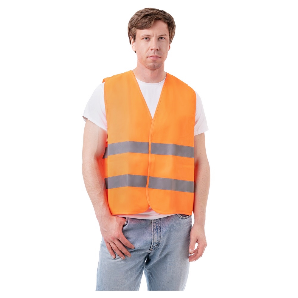 Жилет из влагонепроницаемой ткани (100% полиэфир) оранжевого цвета, с широкими светоотражающими полосами.